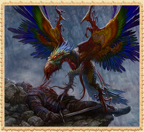 Ein bösartiger Vogel aus dem Schwarm des verfluchten Gottes Eschu, dessen Geist im Labyrinth wieder einmal Fleisch geworden ist. Die Auferstandene Schassar ist noch stärker und ihr Gemüt noch wilder. Der furchterregende Schrei und die verheerenden Gesänge der Kreatur hallen nun immer wieder von den Wänden der unterirdischen Korridore wider und versetzen die waghalsigen Abenteurer in Angst und Schrecken, die sich an diesen furchtbaren Ort hinabwagten.