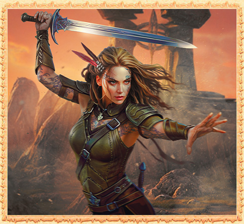 Selbst die wildesten Bestien aus dem dunklen Abgrund des Limbus von Mystras können dieser kriegerischen Anmut keinen Einhalt gebieten! Mit ihrer scharfen Klinge bahnt sie sich den Weg, und der furchterregende Anführer flieht lieber in die Tiefen der Unterwelt, als sich ihrem Angriff entgegenzustellen.