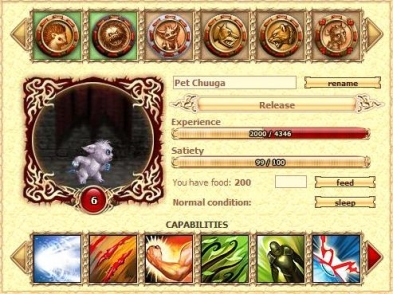 They can indeed be of great help to the warrior during a prolonged battle with fierce enemies, yet all that they ask for in return is little goodies. As little as they are, they can easily fit on their favourite spot - their owner`s shoulder. Battling alongside their possessors, pets raise their level and receive 10% of the experience gained by the owner. It is worth noting, however, that the total amount of experience received by their master will not decrease. Does your pet seem exhausted? You can put it to sleep and after a full cycle of rest it will recharge itself substantially and will be eager to join you on the battlefield once again. Want your pet to rest a little, but also want it to be prepared for battle? Well, you can put it into a relax mode and wake it up at any time.