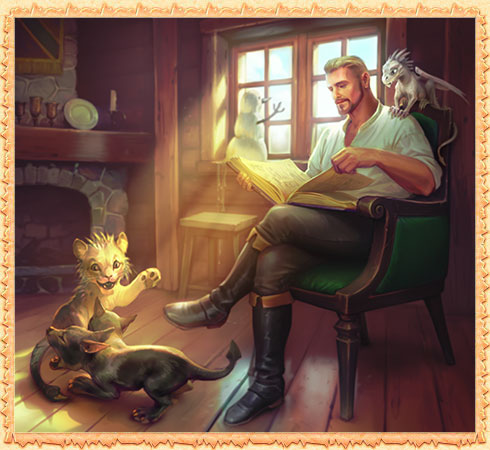 Долгий поход завершен — пришла пора передохнуть и на время отложить оружие. Пока питомцы дурачатся и ласкаются к хозяину, тот погрузился в чтение толстой книги. Что его так захватило? Быть может, воителя унесло далеко за пределы его комнаты красочное описание чужих подвигов. А возможно, он постигает нюансы воинской премудрости, которые потом пригодятся на полях битв.